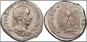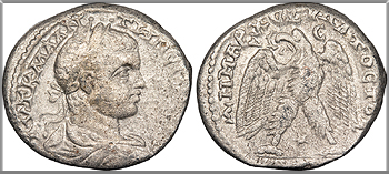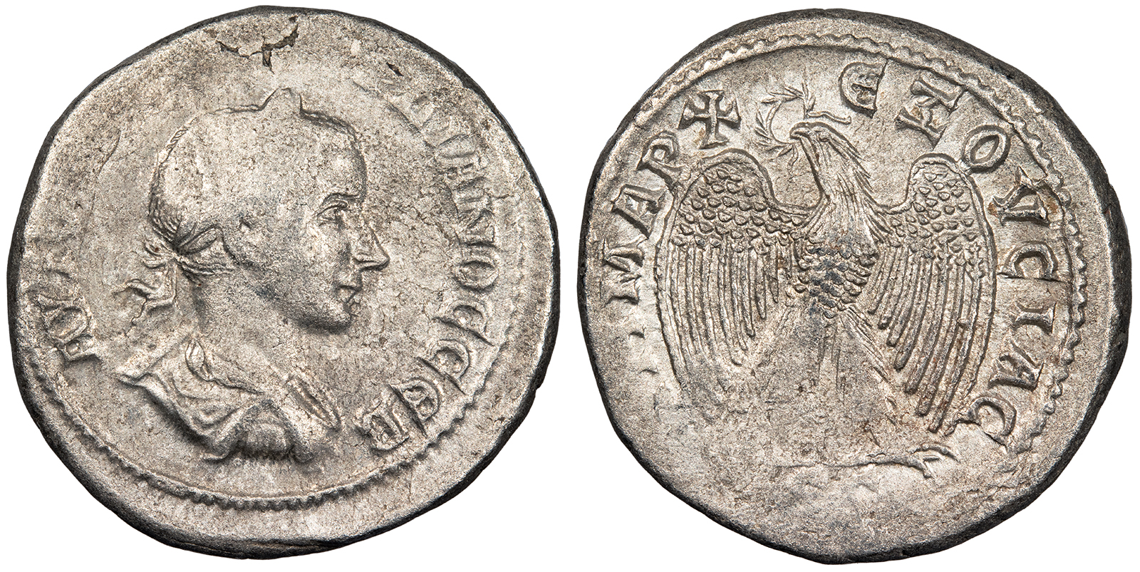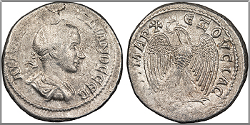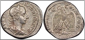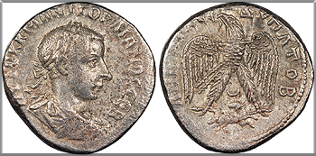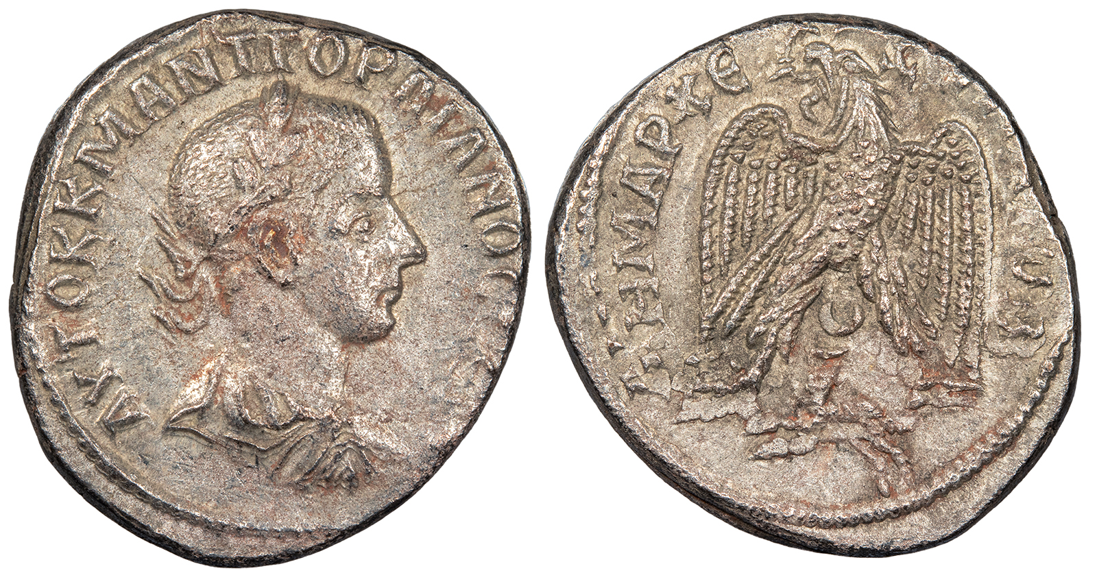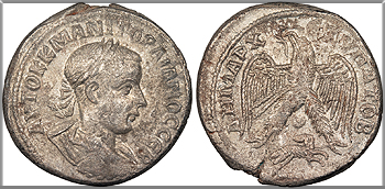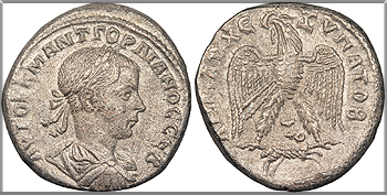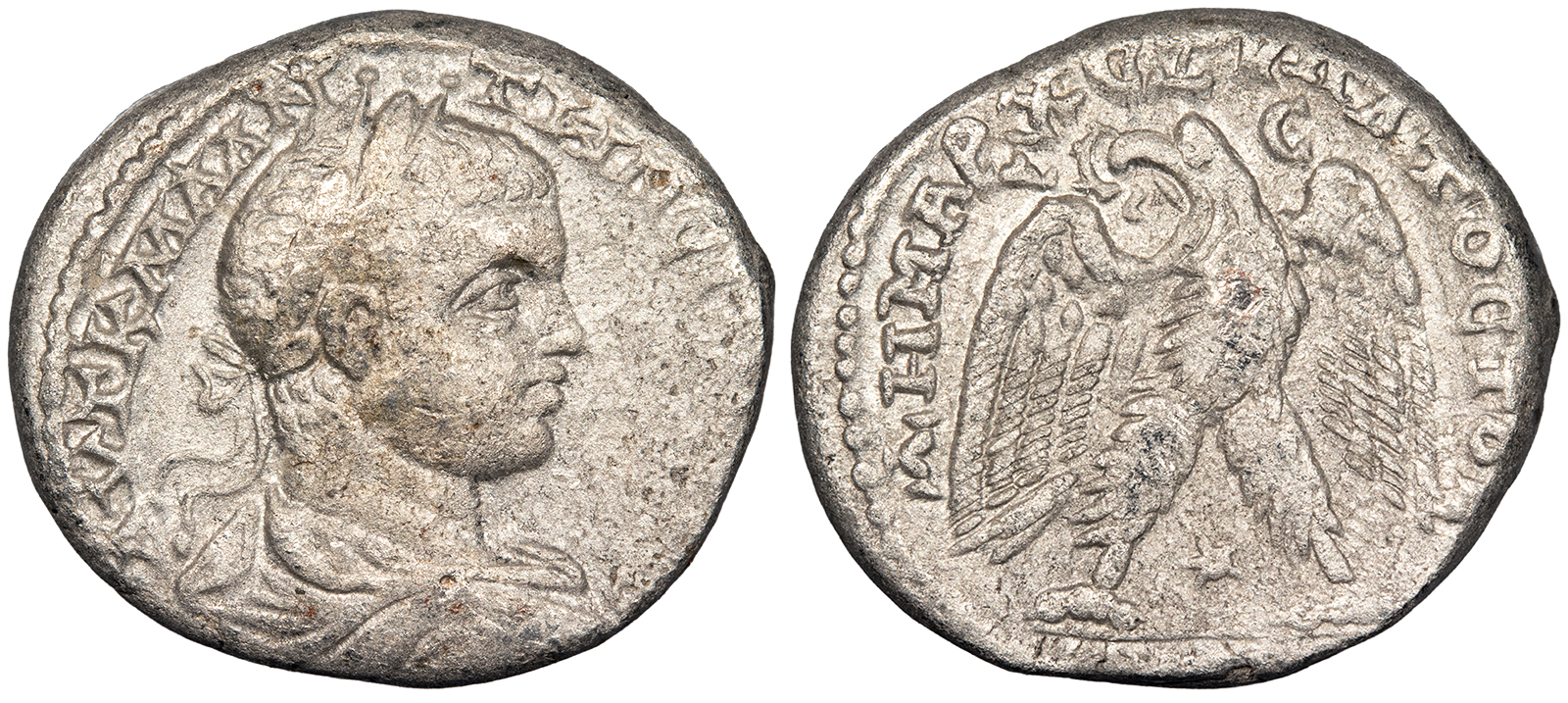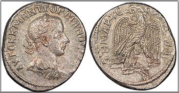 Bi Tetradrachm 26mm. 11.50g. 241-244 A.D. Laureate, draped and cuirassed bust, r., seen from behind. AUTOK K M ANT GORDIANOS SEB Eagle standing facing, wings spread, head l. with wreath in beak; between legs, ram running l. under crescent. DHMARC EX UPA TO B McAlee 872; Prieur 295 Good VF. Lightly toned with much remaining lustre. Reverse a bit double-struck. Typical light porosity.