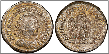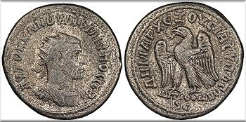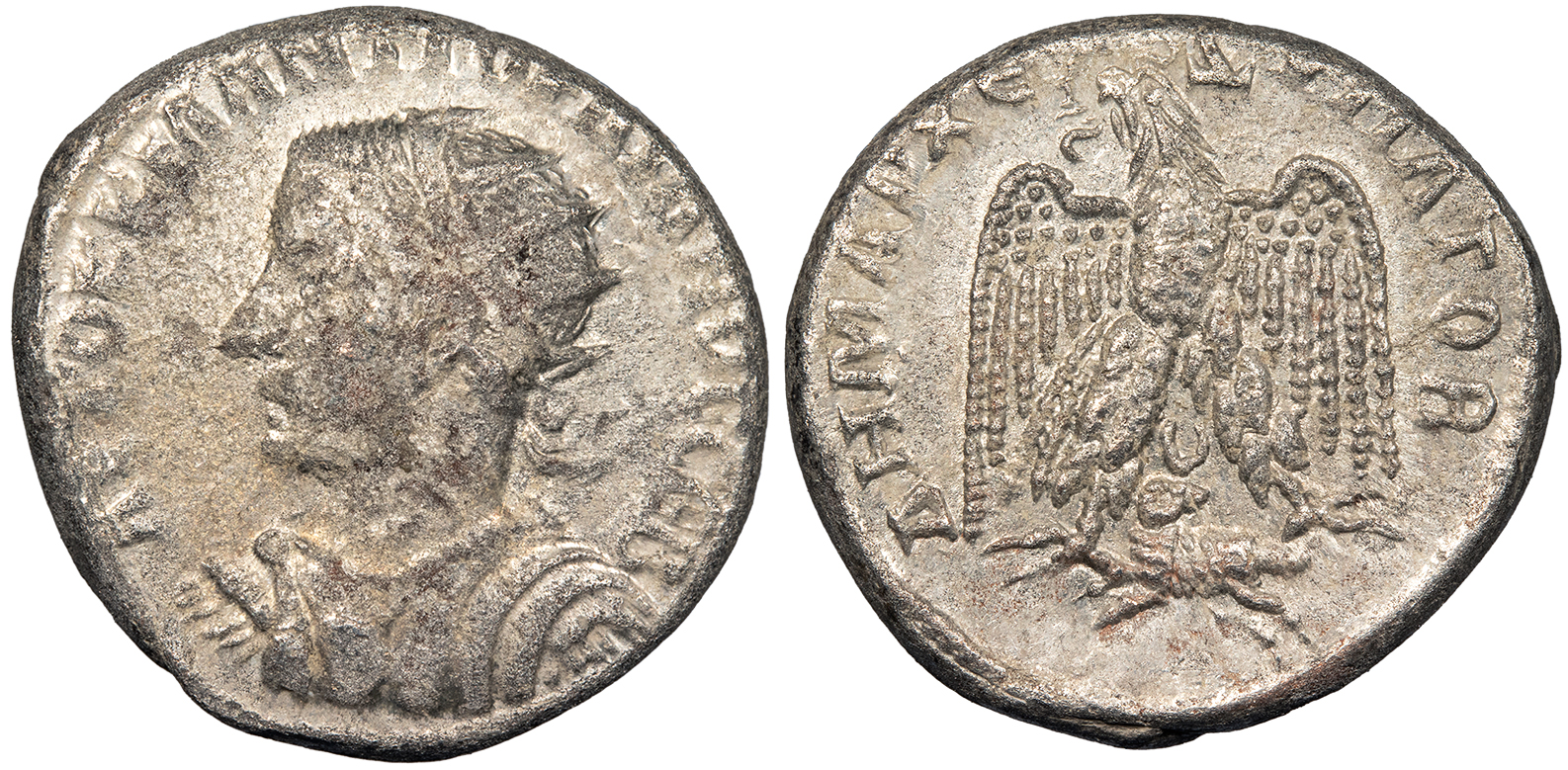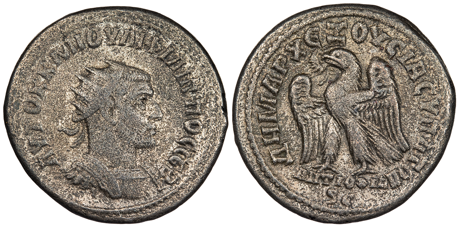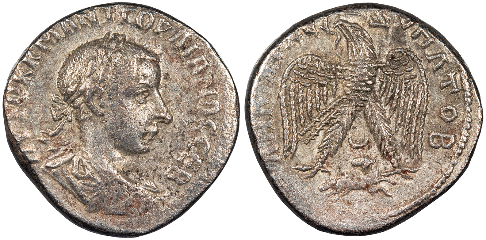 Bi Tetradrachm 27mm. 10.70g. Antioch Mint 249 A.D. Radiate and cuirassed bust, r., seen from front. AUTOK K M IOULI FILIPPOC CEB Eagle standing l., wings open, holding wreath in beak; In ex.: ANTIOXIA/SC DHMARC EXOUCIAC UPATO D Prieur 430A VF. Toned with lustre in fields. Scarce. Slightly weak centers. Lightly porous, as typical.