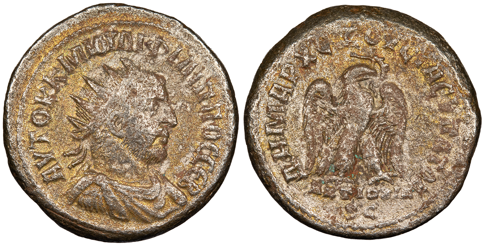 Bi Tetradrachm 27mm. 10.30g. 249 A.D. Radiate, draped and cuirassed bust, r., seen from front. AUTOK K M IOULI FILIPPOS SEB Eagle standing r., head r. with wreath in beak, wings spread; In ex.: ANTIOXIA / SC DHMARC EXOUSIAS UPATO D Prieur 443; McAlee 949 Near VF. Rare. Golden toning with some remaining lustre in devices. Some porosity, as typical. Some rusty adhesions. Listed as 'very rare' in McAlee, and only 6 specimens known to Prieur.