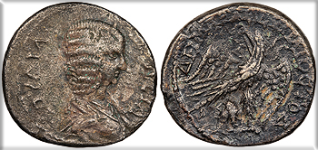 AR Tetradrachm 26mm. 10.40g. 215-217 A.D. Diademed and draped bust, r. IOVLIA AVGOVSTA Eagle standing facing, head l., wings spread, wreath in beak; A below head; radiate, draped and cuirassed bust of Samash l. between legs. DHMARC EX VPATOS TO D Prieur 950 var. (position of A) VF. Rare. Toned, darker on reverse. Some porosity and a few rough spots. Struck with worn obverse die. This exact type is not listed in Prieur with an A under the eagle's head. This reverse is noted for Caracalla (Prieur 953), but not Domna. Reduced from: $180
