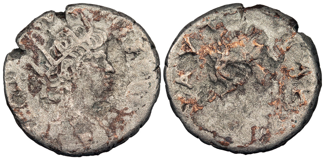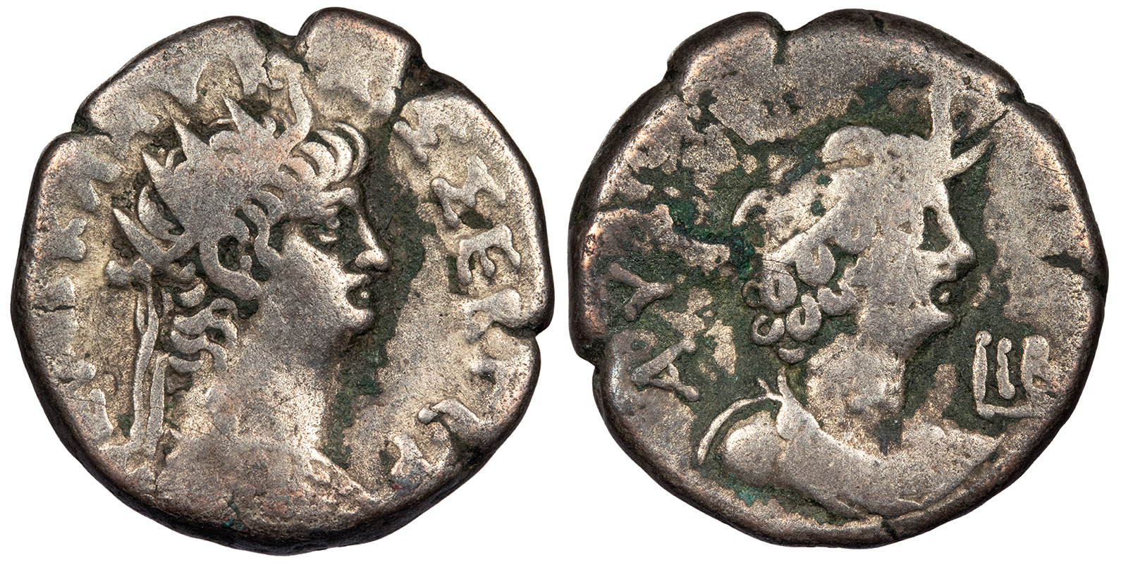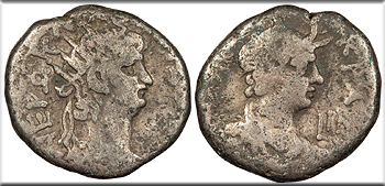 Bi Tetradrachm 19mm. 13.00g. Alexandria Mint RY12 (65/6 A.D.) Radiate bust r., wearing aegis. NERW KLAV KAIS SEB GER Draped bust of Alexandria r., wearing elephant skin headdress; L IB (date) to l. AVTOKRA Emmett 109; RPC I 5289 Good Fine. Gray toning with some lustre in legends. Some green adhesions and typical light porosity.