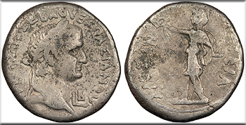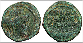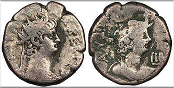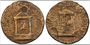 AE19 (3 Units) 19mm. 5.13g. Caesarea Panias (Caesarea Philippi) mint 65-68 A.D. Temple with two columns, enclosing seated figure of Poppaea, l. DIVA POPPAEA AVG Temple with six columns, enclosing standing figure of Claudia (daughter of Nero and Poppaea). DIVA CLAVD NER F RPC I 4846 VF. Brass-brown patina. Some good detail despite issues. Rough and pitted. Once cleaned, now repatinating. This coin honors both Nero's second wife, Poppaea Sabina, and their daughter, Claudia. Poppaea gave birth to Claudia in January 63 A.D., but Claudia lived only four months. Poppaea later died in 65 A.D., perhaps during childbirth or, as has long been believed, after being attacked by Nero. This is the only coinage issued in the name of Nero's daughter.