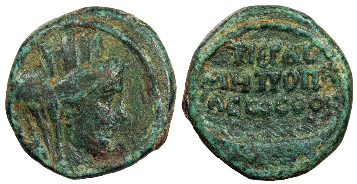 AE22 22mm. 8.51g. Radiate head r. M OP [DIADVMEN]IAN CAE Draped bust of Serapis r., wearing modius. CO[L AEL] KAP COM[M P F] RPC V.3 online 1638 var. (reverse legend); cf. Meshorer 107 VF. Rare. Dark green-brown patina with some tan fill. Some mild roughness and reddish adhesions. An interesting example with an obverse die very similar to those used at Caesarea Maritima; we could find no other examples of this bust style from Aelia Capitolina. The reverse legend is also unusual: instead of the typical CAP, it appears to read KAP, with the A upside down. We could find no other examples. Hadrian founded Aelia Capitolina on the ruins of Jerusalem, dedicating the new city to Jupiter.