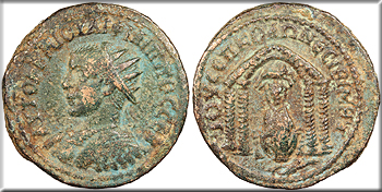 AE25 25mm. 11.60g. Radiate and cuirassed bust, l. AUTOK K M IOVLI FILLIPOC CEB Temple with arched pediment and four columns enclosing draped and turreted Tyche seated facing, ram leaping r. above; below, river god swimming r. IOU CEP KOLW NECIBI MHT RPC VIII (online) 2879 corr. (Philip I); SNG Copenhagen 240 corr. (Philip I) VF. Green patina with some brassy high points. Nice detail for the type. Some minor roughness, as typical. This is now considered to be a type of Philip II.