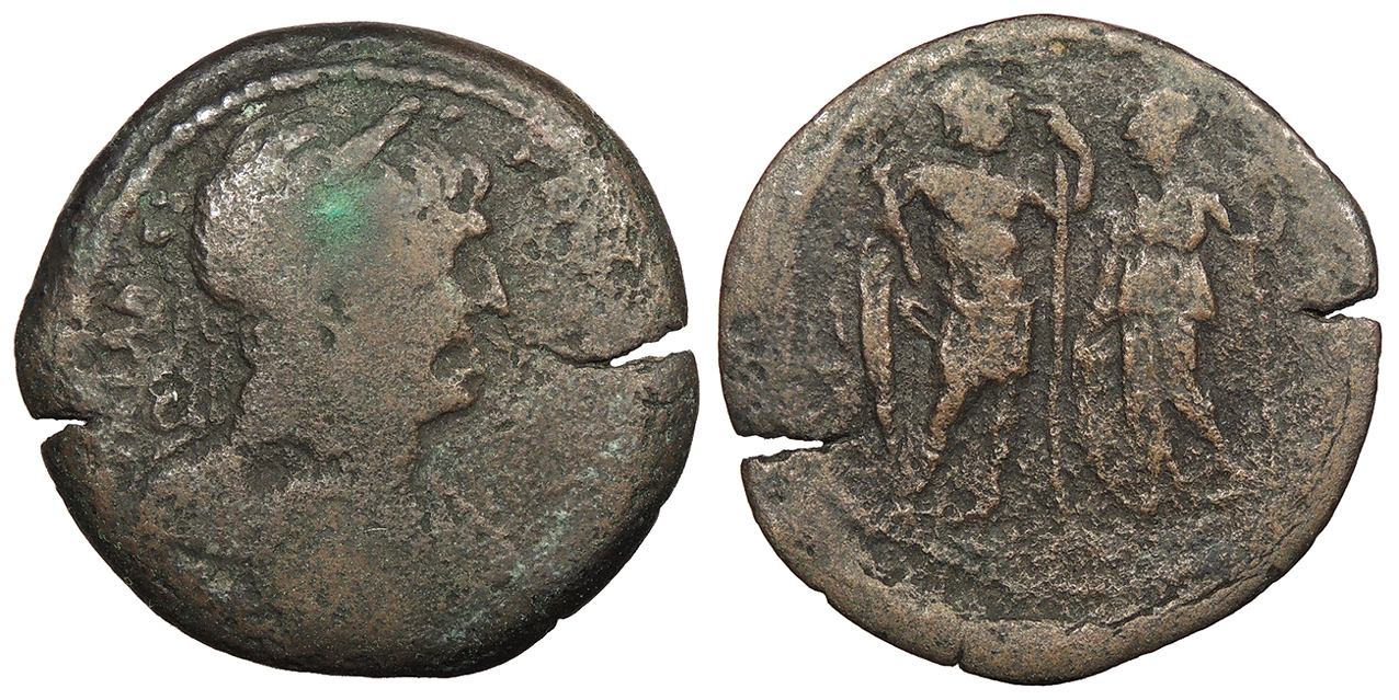 AE Drachm 34mm. 18.60g. Alexandria Mint 107-117 A.D. Laureate bust, r. [AVT] TPAIAN CE[B GEP M DAKIK] Ares standing r., holding parazonium and spear, Athena standing l., holding spear and grounded shield; date in l. field.