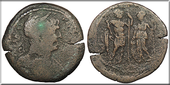 Emmett 2521 VF. Brown patina. Irregular flan. Moderate porosity.