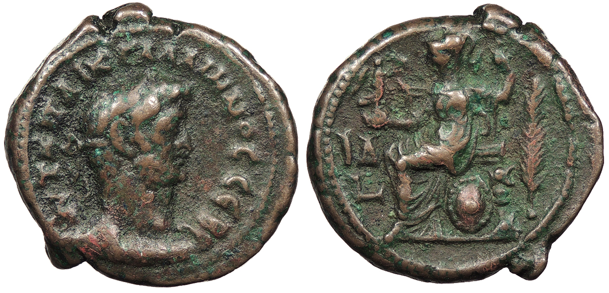 AE Tetradrachm 25mm. 14.06g. Alexandria Mint RY6 (226/7 A.D.) Laureate, draped and cuirassed bust, r. A KAI M AVR CEV ALEXANDROC EV Athena seated l. on throne, holding Nike and spear; L-S (date) across fields.