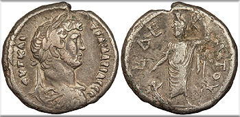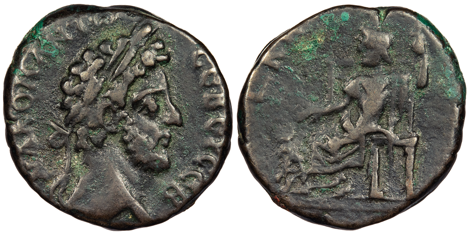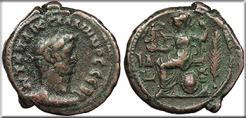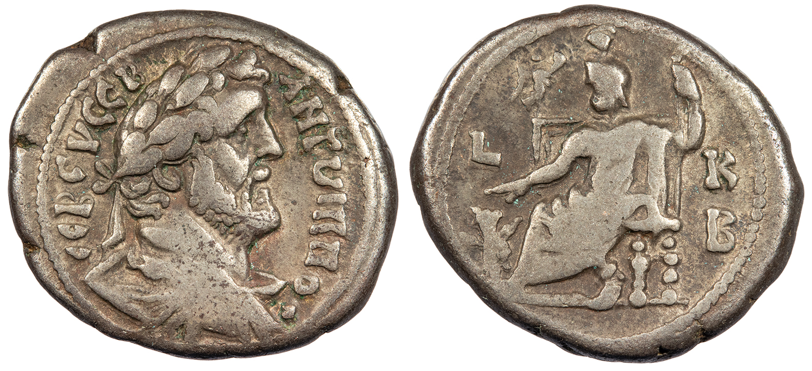 Bi Tetradrachm 26mm. 13.80g. Alexandria Mint Year 22 (158-159 A.D.) Laureate, draped and cuirassed bust, r. ANTQNINOC CEB EV CEB Serapis enthroned l., holding sceptre and extended hand toward Kerberos on l.; L-K/B (date) across fields.