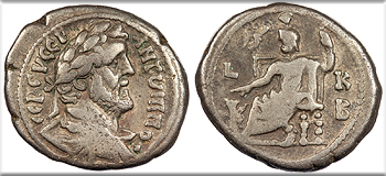 Bi Tetradrachm 24mm. 11.40g. Alexandria Mint RY28 (187/8 A.D.) Laureate head, r. M A KOM ANTW CEBEV CEB Serapis enthroned l. holding sceptre, Kerberos at feet, l.; LKH (date) in upper l. field.