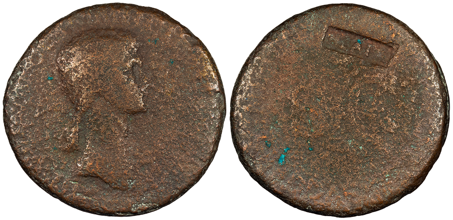 AE Sestertius 33mm. 23.41g. Rome Mint 42-43 A.D. (struck under Claudius) Draped bust r., hair in long plait. [AGRIPPINA M F GERMANICI CAESARIS] Legend around SC; rectangular NCAPR countermark above SC [TI CLAVDIVS CAESAR] AVG GE[RM P M TR P IMP P P] RIC I 102; c/m Pangerl 1 Fair. Brown patina. Worn but identifiable. Moderate porosity. The NCAPR countermark likely stands for 'Nvmmvs Caesare Avgvsto Probatvs' and is believed to have been added to validate use of the coinage under Nero.