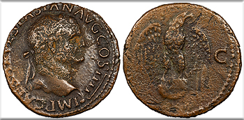 AE As 26mm. 10.15g. Lugdunum Mint 72 A.D. Laureate head r., globe at point of bust. IMP CAESAR VESPASIAN AVG COS IIII Eagle standing facing, wings spread, head r., on globe; S-C to either side.