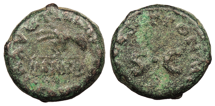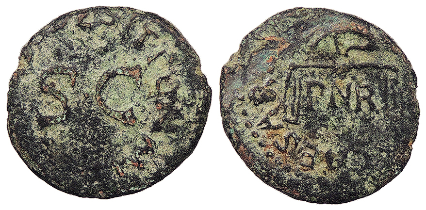 AE Quadrans 16mm. 2.12g. Rome Mint 41 A.D. Hand l., holding pair of scales; PNR below. [TI CLAVDIUS] CAESAR AVG Legend around S C PON M T[R P IMP COS] DES IT RIC I 85 Near VF. Green patina. Mild porosity, as typical. Light scrape on obverse.