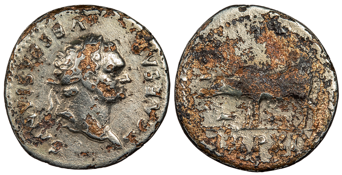 RIC II.1 2; Hendin 6509; RSC II 226 Fine. Lightly toned with good contrast. Some tiny green adhesions. Lightly wiped. Judaea Capta commemorative issue, struck to celebrate Vespasian's defeat of the Jewish Revolt. Vespasian's earliest silver issue, with early style portrait.