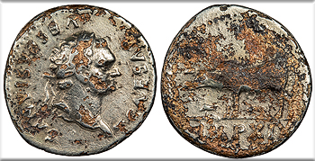 AR Fourée Denarius 19mm. 2.80g. Imitating Rome mint after 77-79 A.D. Laureate head, r. T CAESAR VESPASIANVS Sow l. with three piglets; In ex.: IMP XIX