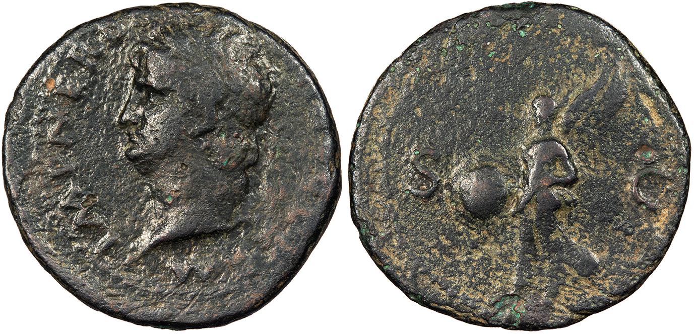 AE As 29mm. 11.31g. Rome mint 66 A.D. Laureate head, l. IMP NERO CAESAR AVG GERM Victory flying l., holding shield inscribed SPQR; S-C to either side.