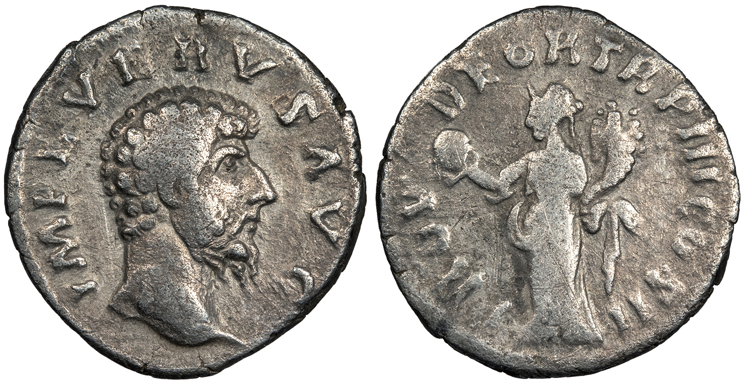 AR Denarius 18mm. 2.90g. Rome Mint 162-163 A.D. Bare head, r. IMP L VERVS AVG Providentia standing l., holding globe and cornucopiae. PROV DEOR TR P III COS II RIC III 491 Good Fine. Toned with some remaining lustre. Some light porosity. A few light old scratches on reverse.