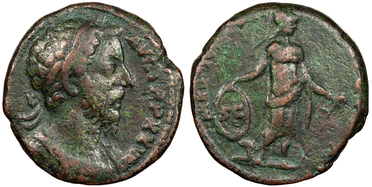 AE As 24mm. 10.63g. Rome Mint 173-174 A.D. Laureate and cuirassed bust, r. [M ANTONINVS] AVG TR P XXVIII Mars, half-draped, standing r., holding spear and resting shield on shoulders of a captive; SC on shield. MARTI [VICTORI IMP VI COS III] RIC III 1108 Near VF. Rare, especially with this bust type. Green-brown patina. Despite RIC noting this type as 'common,' it is far rarer on the market today. This variety, with cuirassed but not draped bust, appears very rare; we could find only one other example. Reduced from: $175