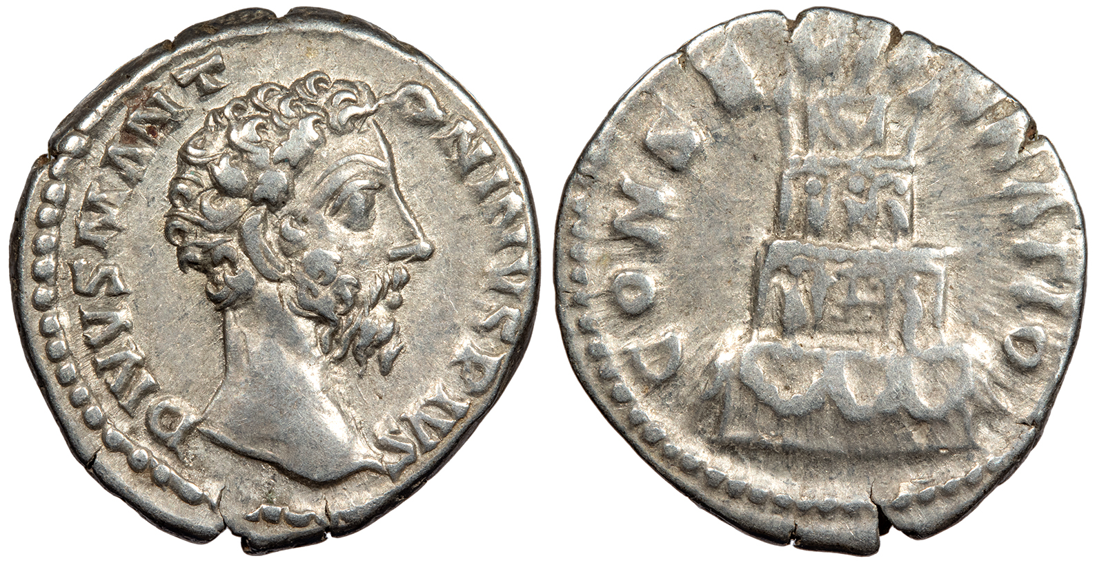 AR Denarius 18mm. 3.46g. Rome Mint 180 A.D. (under Commodus) Bare head, r. DIVVS M ANTONINVS PIVS Funeral pyre of four tiers, decorated with statues and garlands, surmounted by quadriga. CONSECRATIO RIC III 275 Good VF. Lightly toned and lustrous. Struck with worn reverse die. Reduced from: $195
