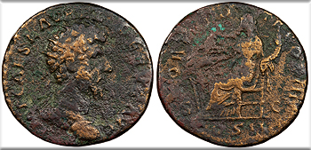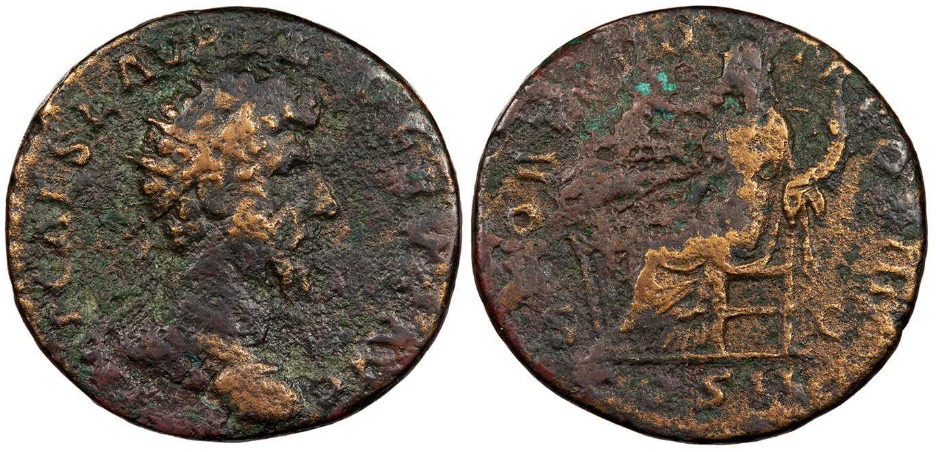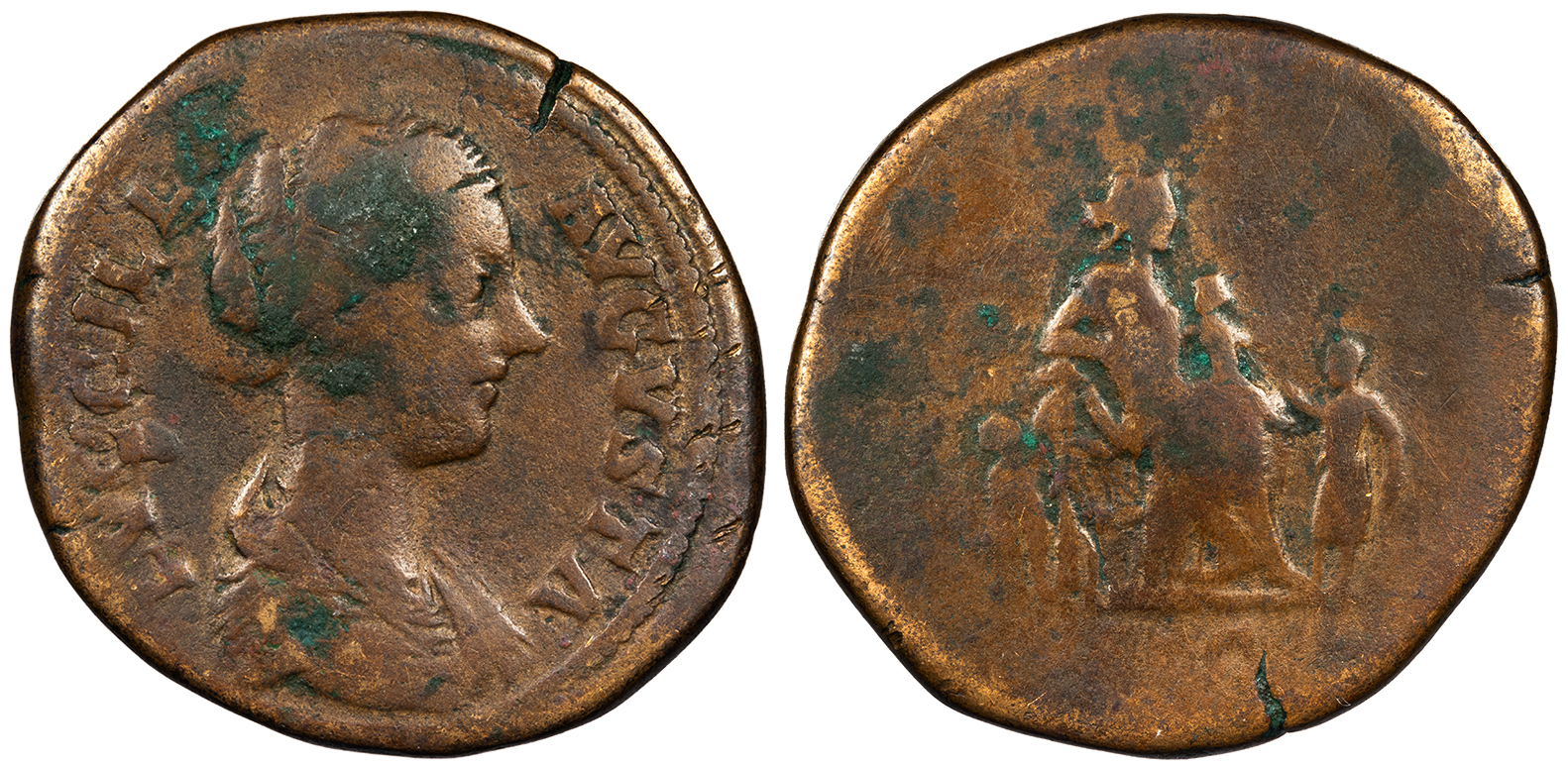 AE Sestertius 33mm. 19.75g. Rome Mint Draped bust, r. LVCILLA AVGVSTA Fecunditas seated r., nursing a child held in her lap; before and behind, a child standing raising r. hand; In ex.: SC [FECVNDITAS] RIC III 1736 About Fine. Brown patina. Weak reverse. Light nicks. Adhesions.