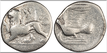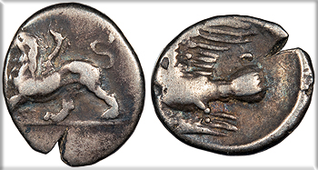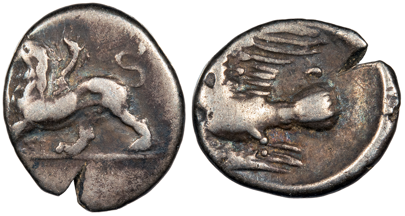 AR Hemidrachm 17mm. 2.64g. Chimera advancing l. with forepaw raised; SI below.