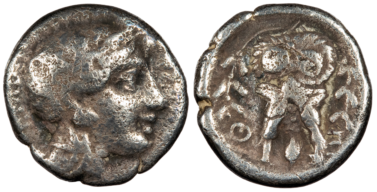 Athena Itonia advancing r., brandishing spear and shield; [FI-LOK] across fields along spear; A/S-OP across inner fields; monogram to lower inner r. QESSA/LWN HGC 4, 226; Rogers 31 Good VF. Dark green-brown patina. A bit off-center with some trace roughness.