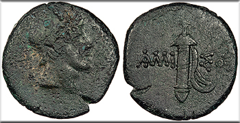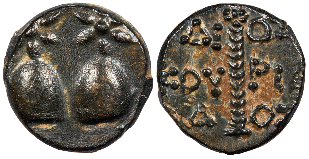 Sword in sheath, legend to either side; no monograms or control marks. AMI-SOU HGC 7, 241; SNG Black Sea 1147-65 Near VF. Nearly black patina. Uneven strike with weak obverse. Moderate porosity. From the Southwood Collection.