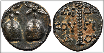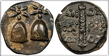 Quiver and unstrung bow; legend to either side. AMI-SOU HGC 7, 250; SNG Black Sea 1142-3 Good Fine. Rare. Nearly black patina. Light porosity and some tiny pits, as is not unexpected. From the Southwood Collection.