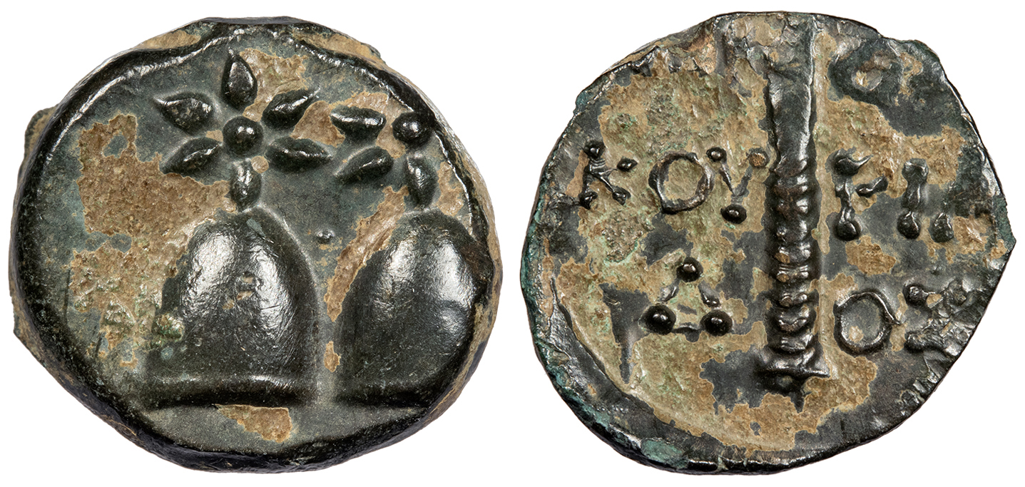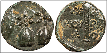 AE17 17mm. 4.00g. Pilei of the Dioscuri surmounted by stars.