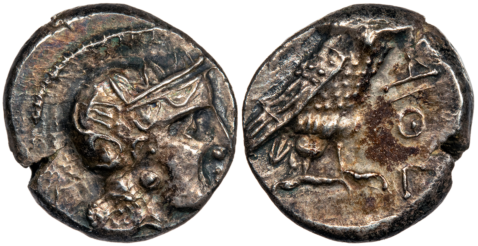 Owl standing r., head facing; olive branch and crescent behind; AQE to r.