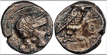 Owl standing facing between olive branches; A/Q-E around (E retrograde).
