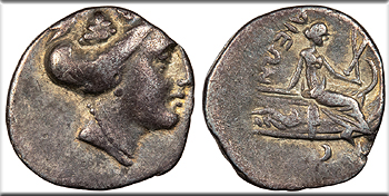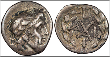 AR Tetrobol 13mm. 1.30g. Head of Maenad (the Nymph Histiaea) right, wearing vine wreath, necklace, and earrings.