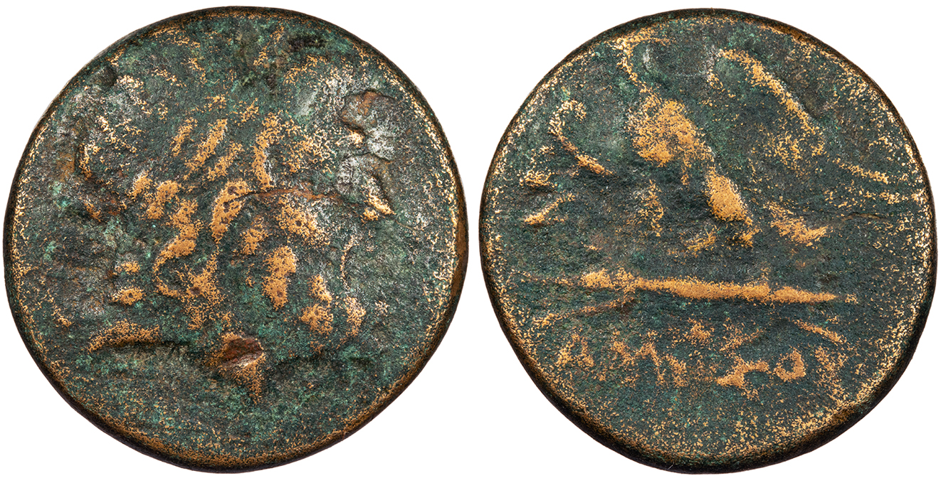 Eagle with wings spread standing l. on thunderbolt, head reverted; monogram to l.; legend below. AMISOU HGC 7, 237; SNG Black Sea 1144-6 About Fine. Dark green patina with coppery high points. Somewhat scarce. Mild porosity. A few cleaning abrasions. From the Southwood Collection.