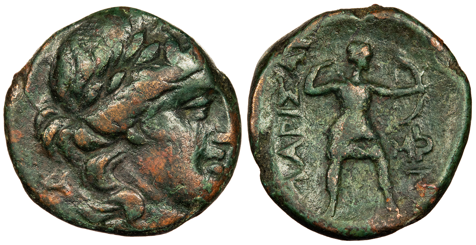 Artemis standing r., shooting bow; monogram in inner r. field. LARISAI/WN HGC 4, 519 VF. Scarce. Dark green-red patina. Boldly struck. A bit off-center. Trace roughness.
