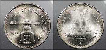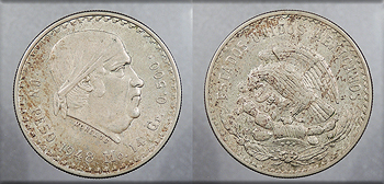 AR 5 Pesos Cuauhtemoc eagle standing left on cactus, devouring snake; floral sprays below.