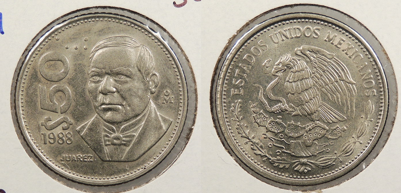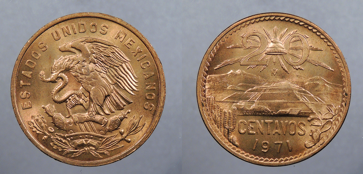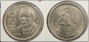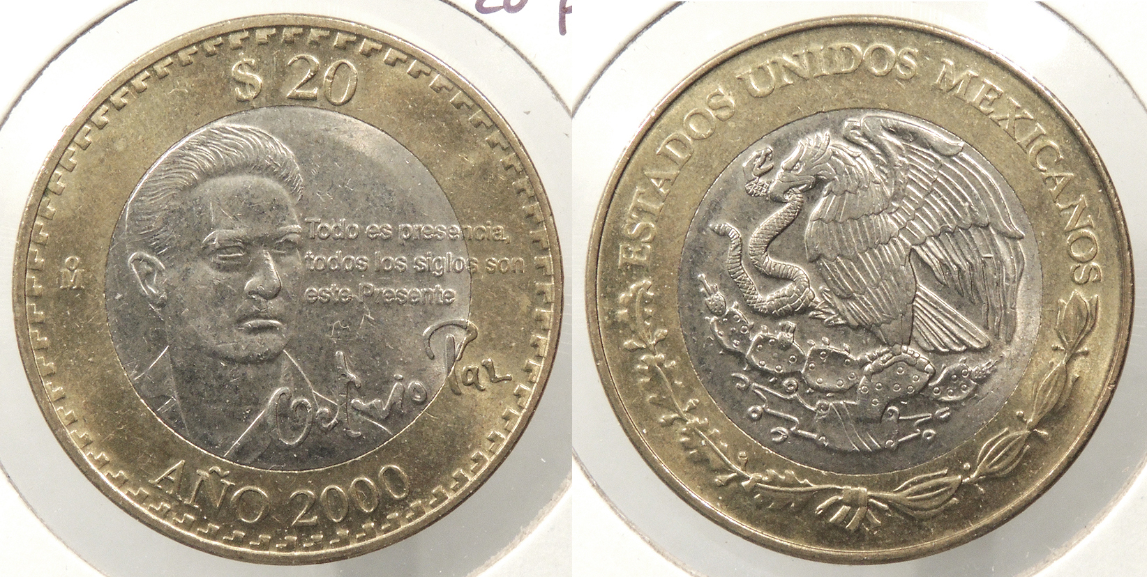 Bi-Metallic 20 Pesos Cu-Ni center in brass ring.