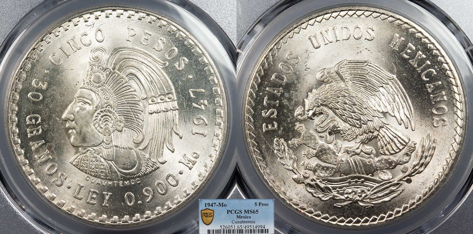 MEXICO 1947-Mo Cuauhtemoc 5 Pesos PCGS MS-65 -- #WC105618