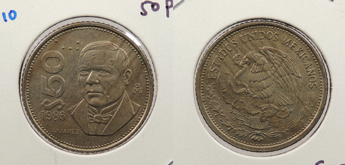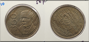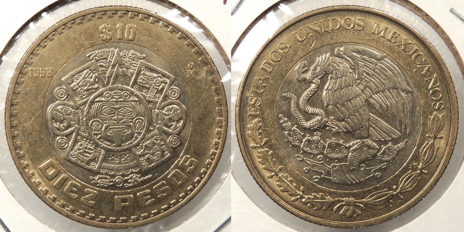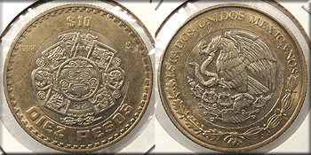 Bi-Metallic 10 Pesos Cu-Ni center in bronze ring.