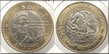 MEXICO 2000 Cu-Ni center in brass ring. 20 Pesos -- #:WC63003