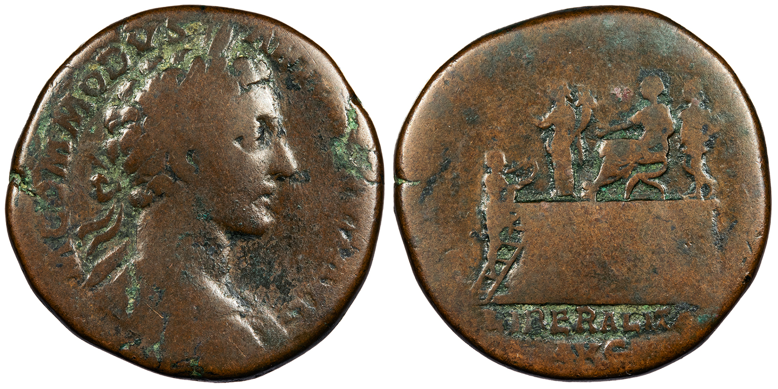 AE Sestertius 30mm. 22.55g. Rome Mint 180 A.D. Laureate, draped and cuirassed bust, r. M COMMODVS ANTONINVS AVG Commodus seated l. on curule chair set on platform; attendant standing behind; Liberalitas stands to l. holding tessera and cornucopia; citizen on l. mounting steps; S-C to either side; In ex.: LIBERALITAS / AVG [AVG TR P V IMP IIII COS II P P] RIC III 300 About Fine. Scarce. Glossy brown patina with some green contrast. Very worn. Some smoothing. Reduced from: $125