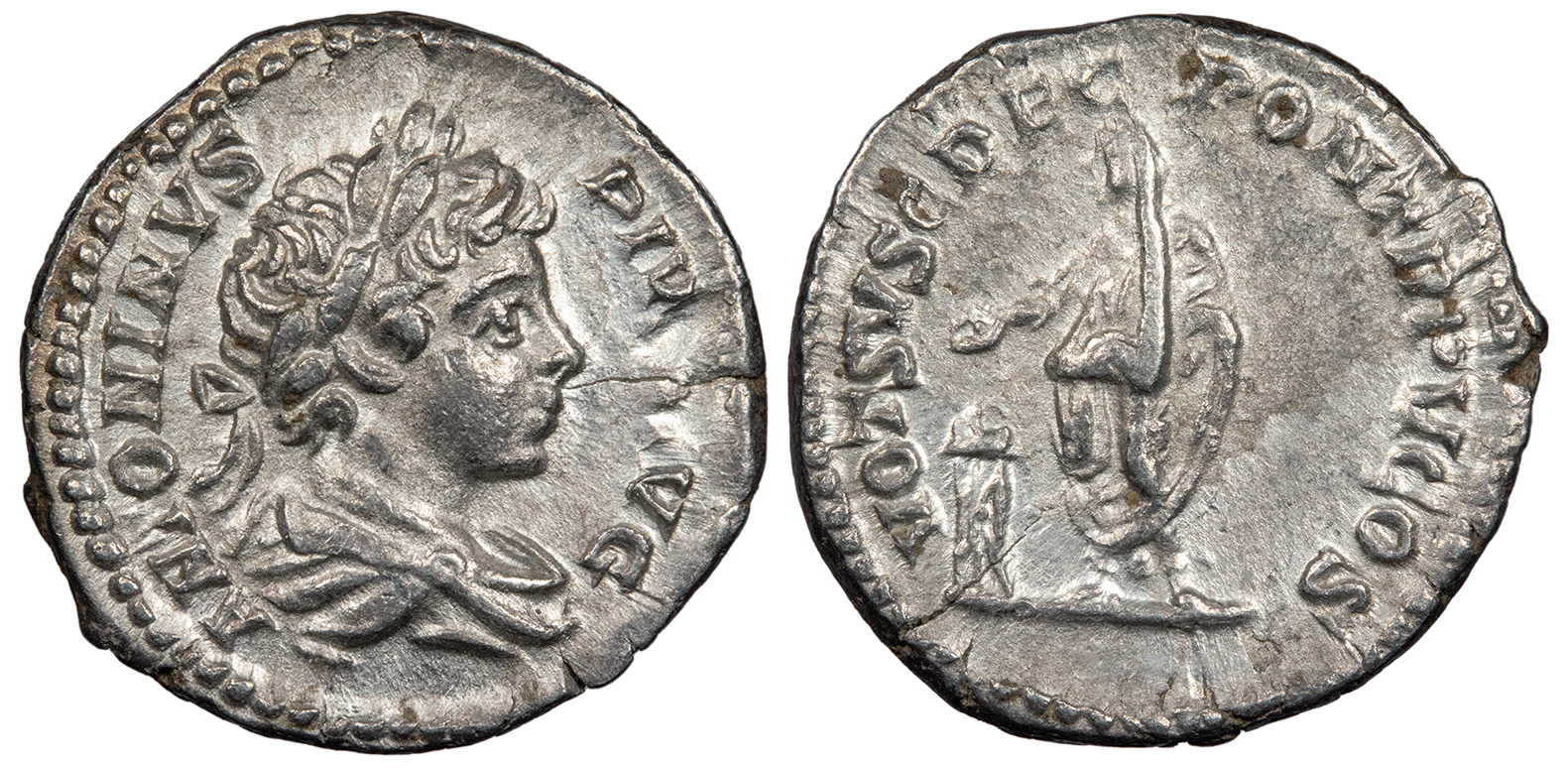 AR Denarius 18mm. 2.99g. Rome Mint 202 A.D. Older boy's laureate and draped bust r. ANTONINVS PIVS AVG Caracalla, veiled, standing l., sacrificing out of patera over tripod and holding roll. VOT SVSC DEC PON TR P V COS RIC IV 68; RSC III 686 Near EF. Lightly toned and brightly lustrous. Tiny flan crack.
