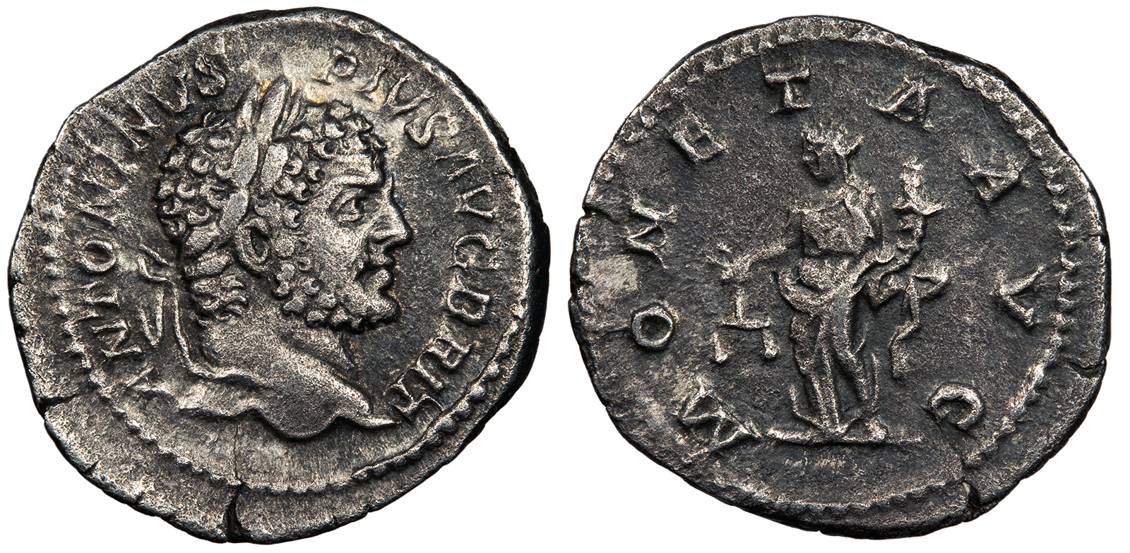 AR Denarius 20mm. 2.57g. Rome Mint 212-213 A.D. Laureate head, r. ANTONINVS PIVS AVG BRIT Moneta standing l., holding scales and cornucopiae. MONETA AVG RIC IV 224; RSC III 165 Near EF. Toned with hints of lustre in devices. Nice portrait with good detail. Moderate porosity with subsequent light weight.