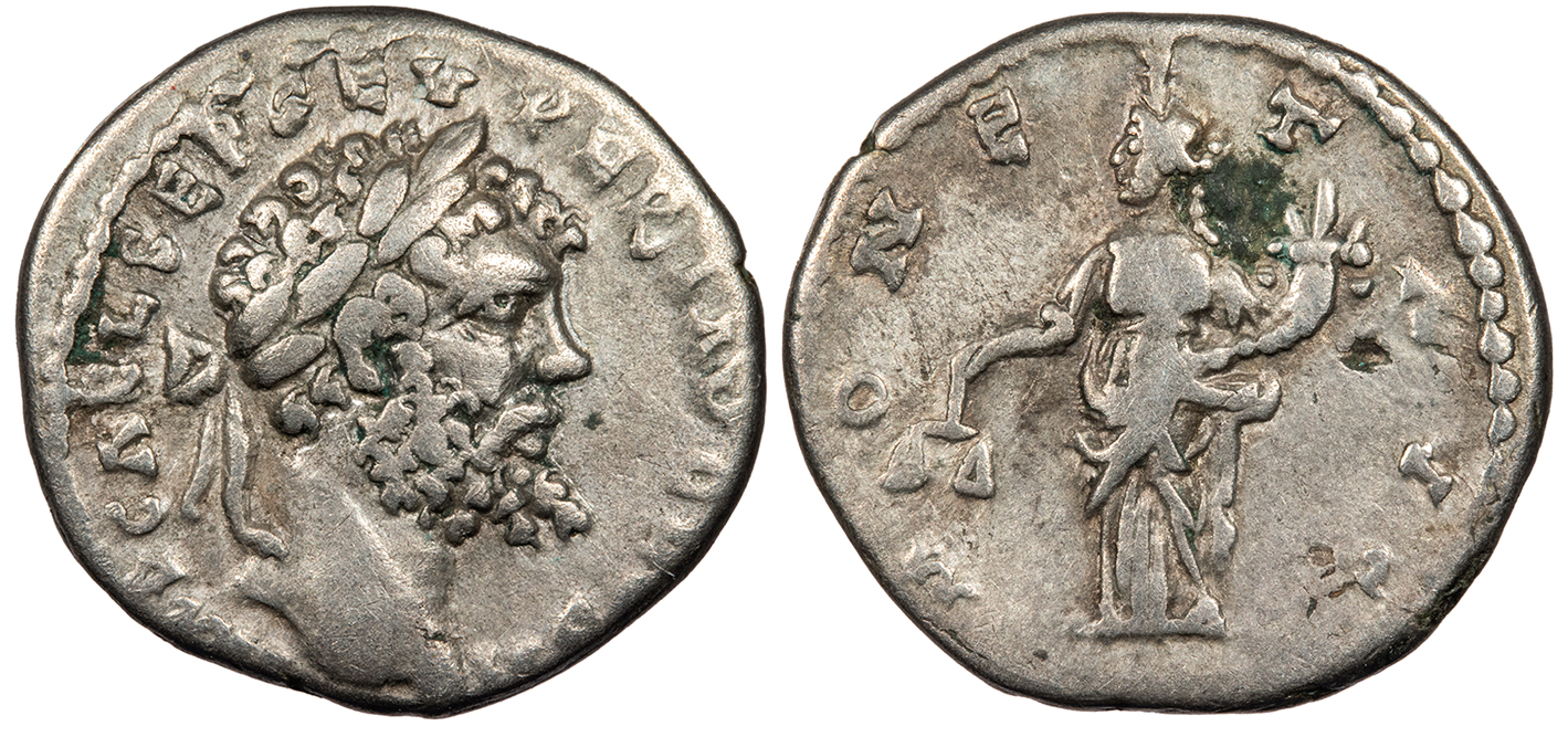 AR Denarius 18mm. 3.39g. Emesa Mint 194-195 A.D. Laureate head, r. IMP CAE L SEP SEV PERT AVG COS II Moneta standing facing, head l., holding scales and cornucopiae. MONET AVG RIC IV 411a; RSC III 330 VF. Toned. Lightly wiped. Small adhesion. A few tiny pits.