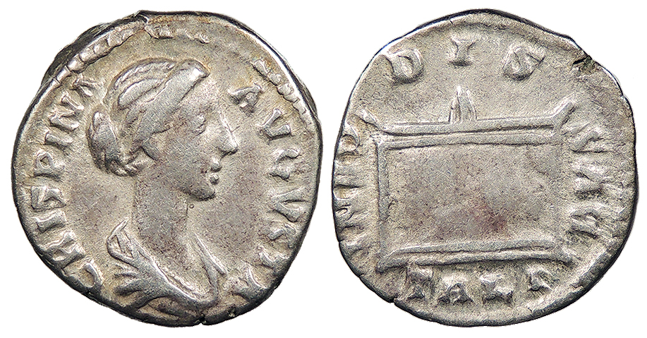 AR Denarius 18mm. 3.15g. Rome Mint 178-182 A.D. Draped bust, r. CRISPINA AVGVSTA Lighted altar. DIS GENITALIBVS RIC III 281; RSC II 15 Good Fine. Toned with much lustre in devices. A few traces of porosity. This type depicts an altar dedicated to the ‘dei genitales,’ the gods of birth.