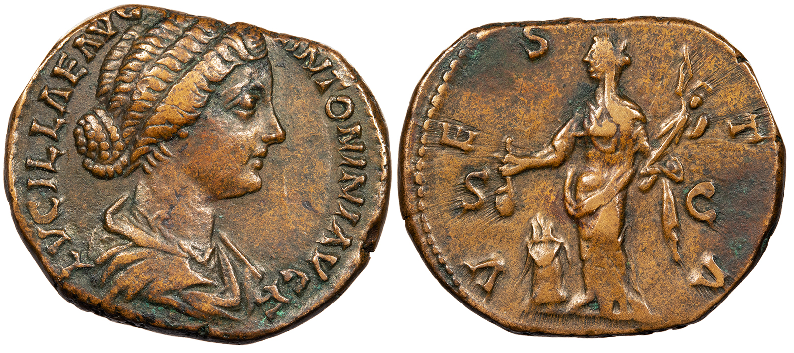 AE As 26mm. 11.40g. Rome Mint 161-162 A.D. (Under Marcus Aurelius and Verus) Draped bust, r., hair bound behind head. LVCILLAE AVG ANTONINI AVG F Vesta, veiled, standing l. by altar, holding simpulum and palladium; S C to either side. VESTA RIC III 1780 Nice VF. Mottled brown patina. Nice fields and pleasing portrait. Slightly irregular flan. Small ancient file mark on edge. ex. Classical Numismatic Group CNR XLV.2 'Empress Collection,' with ticket; ex. Phil Peck collection; ex. Morris collection; ex. CNG Auction 73 September 13, 2006; includes ticket citing ex. Spink 120 July 1997, lot 158. Reduced from: $290