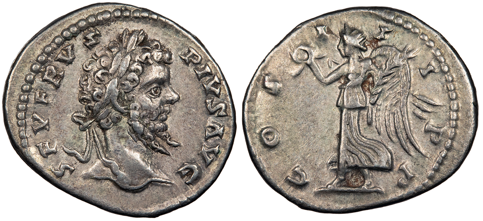 AR Denarius 20mm. 3.80g. Laodicea mint 202 A.D. Laureate head, r. SEVERVS PIVS AVG Victory advancing l., holding wreath and palm COS III P P RIC IV 526; RSC III 102 Good VF. Nicely toned with underlying lustre. Good metal. Ex Vauctions (Triskeles) 323; 546. Includes ticket. Reduced from: $140