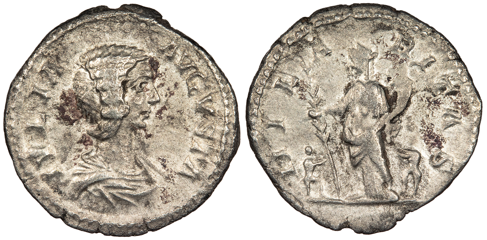 AR Denarius 19mm. 3.00g. Rome mint 207-211 A.D. Draped bust, r. IVLIA AVGVSTA Hilaritas standing half-left between two boys, holding palm and cornucopiae. HILARITAS RIC IV 557; RSC III 79 VF. Toned and nearly fully lustrous. Some patchy adhesions.