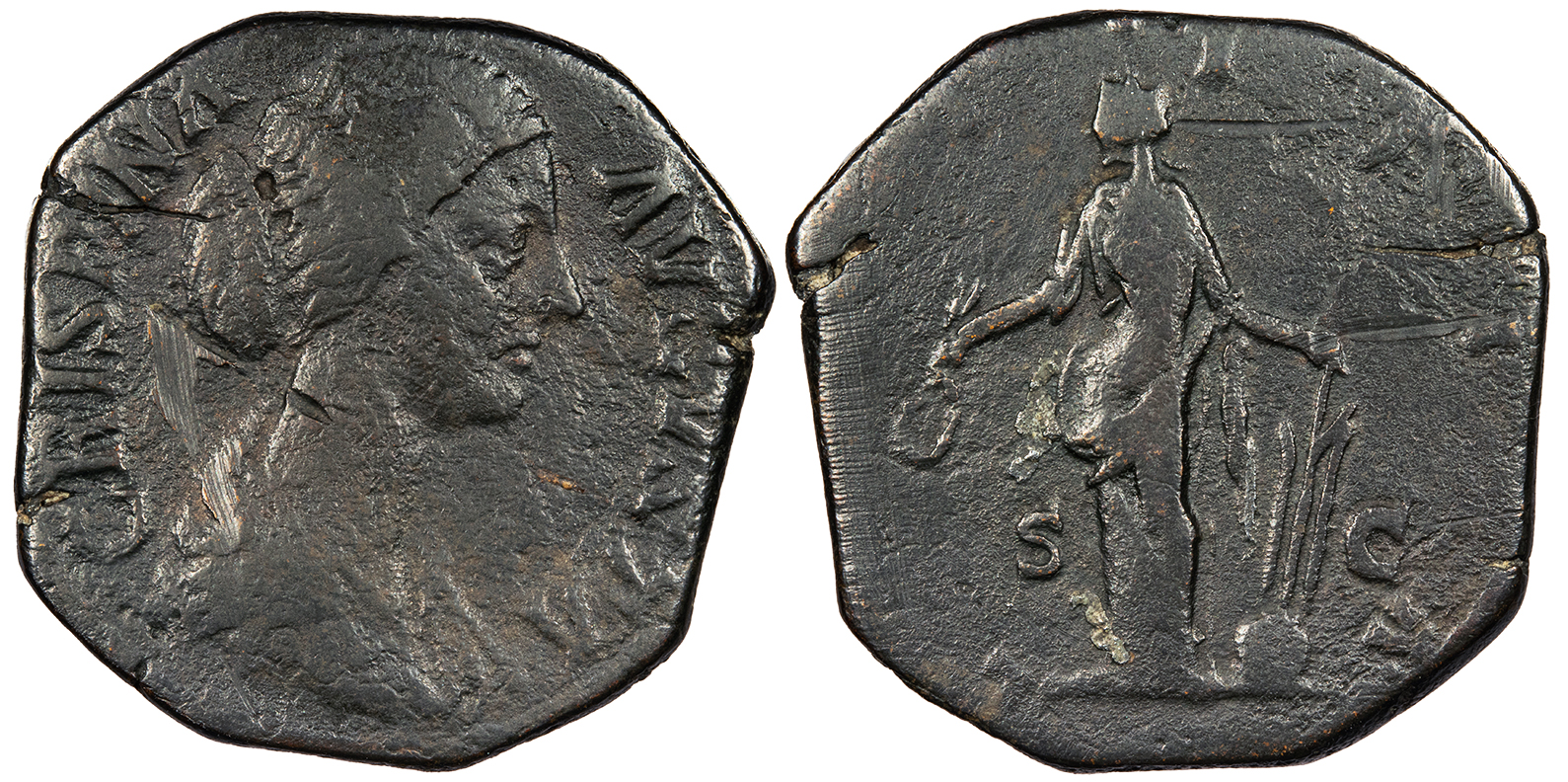 AE Sestertius 30mm. 20.56g. Rome mint 180-183 A.D. Draped bust r., with hair in bun. CRISPINA AVGVSTA Laetitia standing l., holding wreath and rudder on globe; S-C to either side. LAETITIA RIC III 669 Fine. Nearly black patina. Some mild rough spots. Some scrapes and file marks beneath patina. A budget example of a scarcer type.