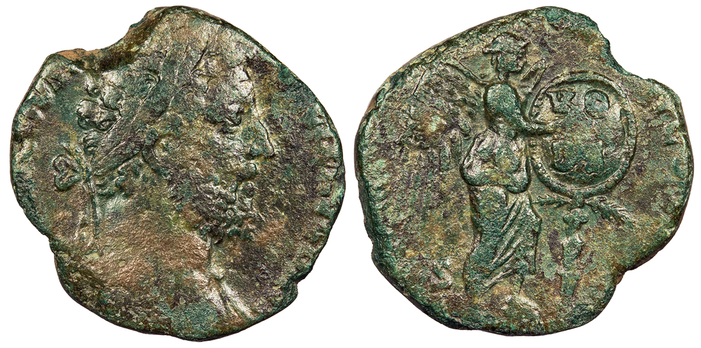 AE Sestertius 27mm. 13.48g. Rome mint 186 A.D. Laureate head, r. M COMMODVS ANT P FELIX AVG BRIT Victory standing r., foot on helmet, inscribing VO/DE on shield set on palm; S-C to either side. SAEC FEL P M TR P XI IMP VII COS V P P RIC III 472 Good Fine. Green mottled patina. Bold reverse for the grade. Highly irregular and lightweight flan. Crowded legends. Some rough areas. An interestingly crude example of a normally well-produced type. When researching other examples sold at auction, it becomes apparent that examples of typical fine Roman production are of full weight, while those that are more crudely produced better match the weight of a dupondius.