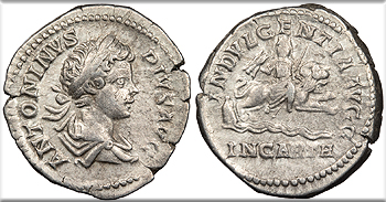 AR Denarius 19mm. 3.35g. Rome Mint 203 A.D. Laureate and draped bust, r. ANTONINVS PIVS AVG Dea Caelestis riding r., on lion, holding thunderbolt and sceptre; below, waters gushing from rock; In ex.: IN CARTH INDVLGENTIA AVGG RIC IV 130a; RSC III 97 VF. Lightly toned and lustrous. Good reverse detail. Slight porous spots. This type may refer to the aqueducts at Carthage. Reduced from: $145