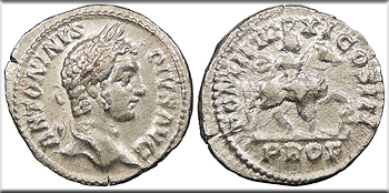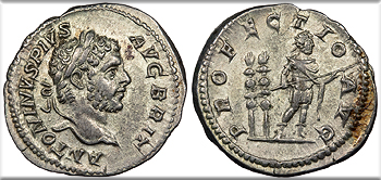 AR Denarius 20mm. 3.26g. Rome Mint 212-213 A.D. Laureate head, r. ANTONINVS PIVS AVG BRIT Caracalla standing r., holding spear; two signa behind. PROFECTIO AVG RIC IV 225; RSC III 508 EF. Nicely toned and fully lustrous. Sharp. Reduced from: $250